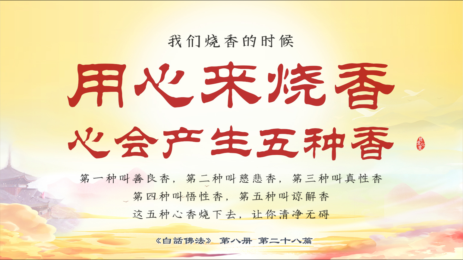 不限会员 8-28-16我们烧香的时候用心来烧香,心会产生五种香,第一种叫善良香,第二种叫慈悲香,第三种叫真性香,第四种叫悟性香,第五种叫谅解香。这五种心香烧下去,让你清净无碍。【图】