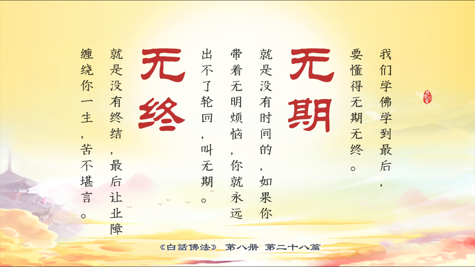 不限会员 8-28-26我们学佛学到最后,要懂得无期无终。无期就是没有时间的,如果你带着无明烦恼,你就永远出不了轮回,叫无期。无终就是没有终结,最后让业障缠绕你一生,苦不堪言。【图】