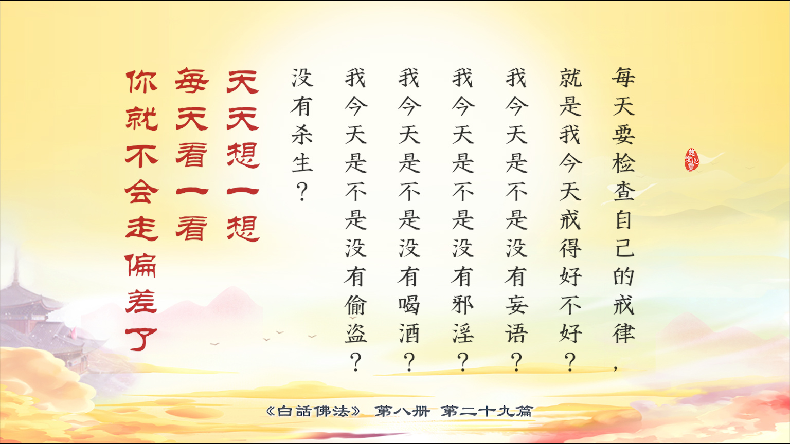 不限会员 8-29-4每天要检查自己的戒律,就是我今天戒得好不好?是不是没有妄语?是不是没有邪淫?是不是没有喝酒?是不是没有偷盗?没有杀生?天天想一想,每天看一看,你就不会走偏差了。【图】