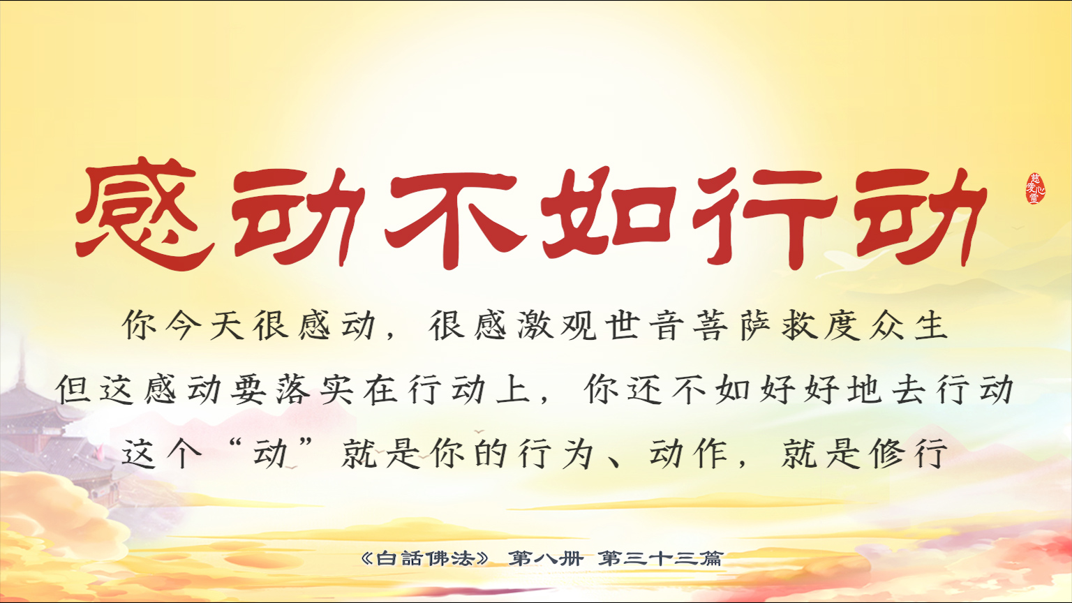 不限会员 8-33-34 感动不如行动,你今天很感动,很感激观世音菩萨救度众生,但这感动要落实在行动上,你还不如好好地去行动,这个“动”就是你的行为、动作,就是修行。【图】