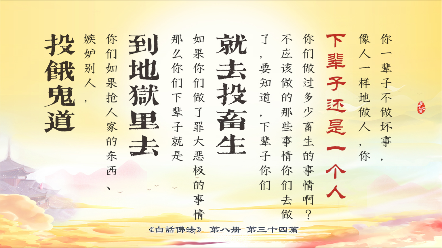 不限会员 8-34-4你一辈子不做坏事...下辈子还是一个人。你们做过多少畜生的事情啊...下辈子去投畜生。你们做了罪大恶极的事情...下辈子到地狱里去。如果抢人家的东西、嫉妒别人,投饿鬼道。【图】