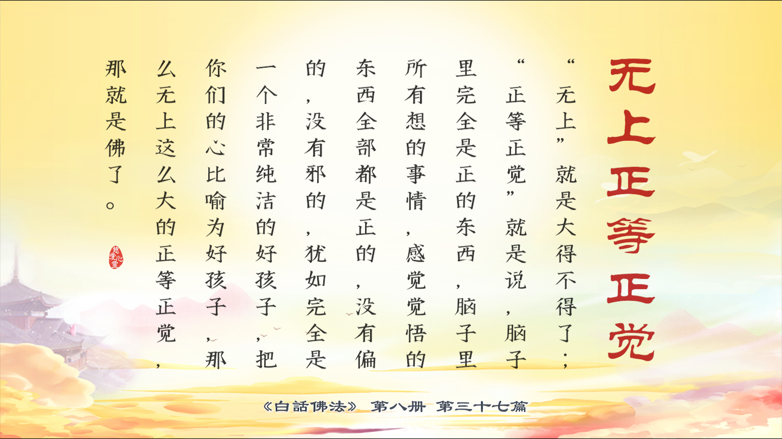 不限会员 8-37-16“无上”就是大得不得了;“正等正觉”就是说,脑子里完全是正的东西...感觉觉悟的东西全部都是正的,没有偏的,没有邪的...那么无上这么大的正等正觉,那就是佛了。【图】