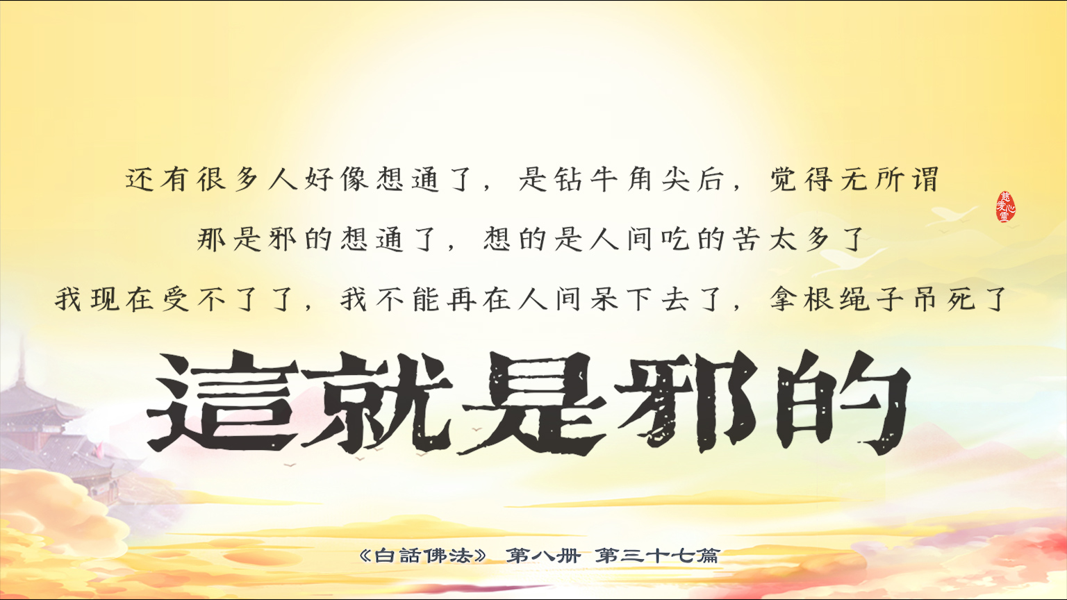 不限会员 8-37-19很多人好像想通了,是钻牛角尖后,觉得无所谓,那是邪的想通了,想的是人间吃的苦太多了,我现在受不了了,我不能再在人间呆下去了,拿根绳子吊死了,这就是邪的。【图】