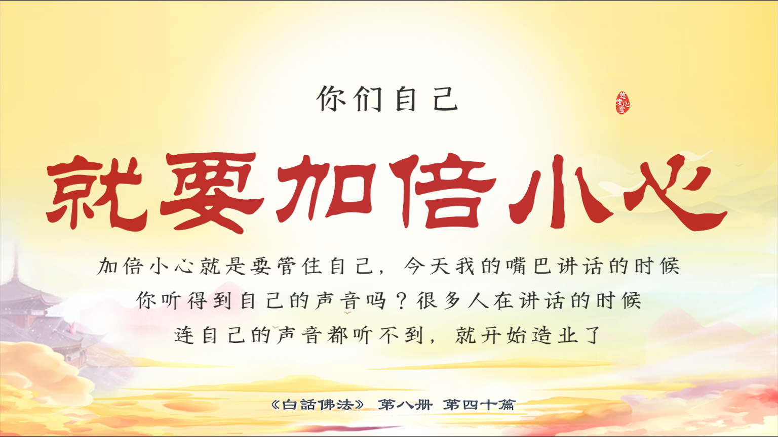 不限会员 8-40-8 你们自己就要加倍小心。加倍小心就是要管住自己,今天我的嘴巴讲话的时候,你听得到自己的声音吗?很多人在讲话的时候连自己的声音都听不到,就开始造业了。【图】
