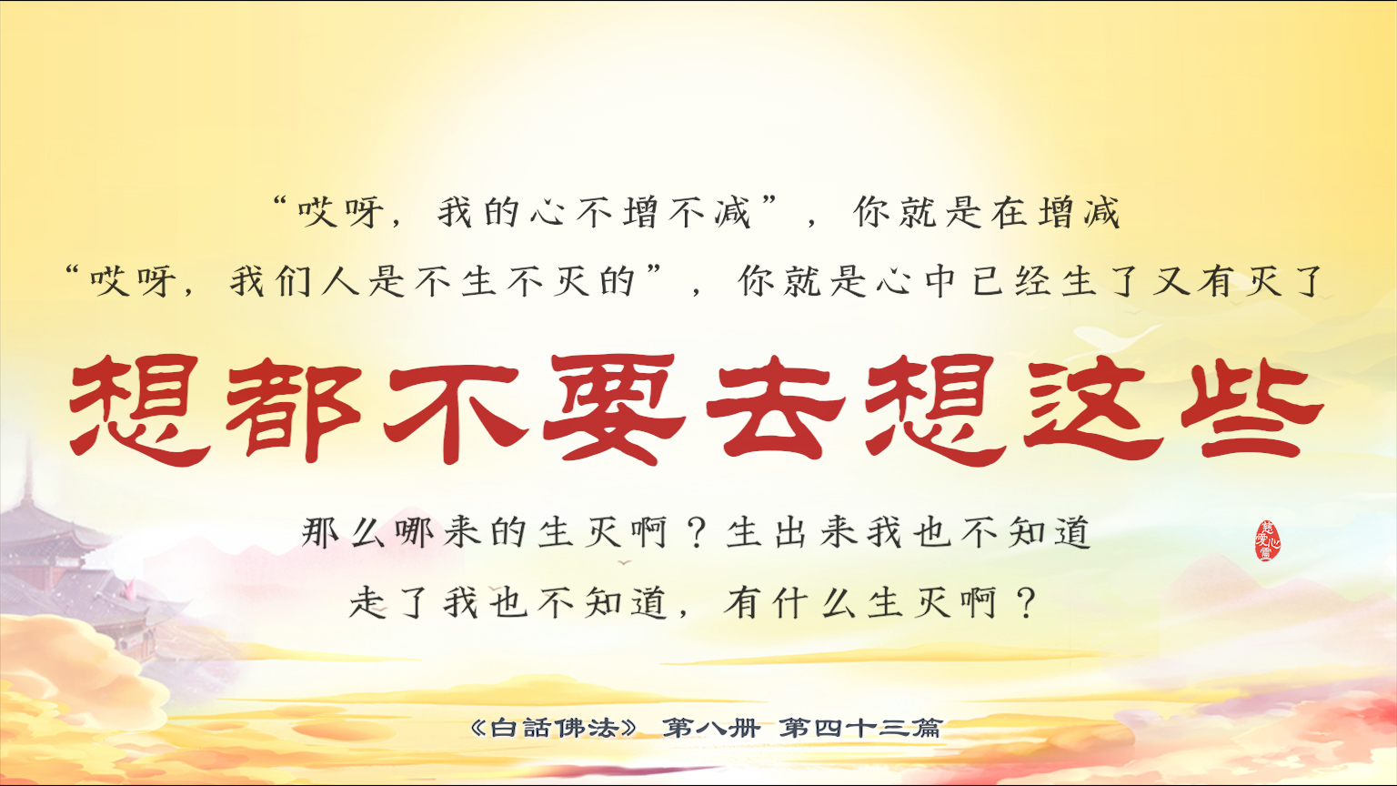 不限会员 8-43-2“我的心不增不减”,你就是在增减...人是不生不灭的”,你就是心中已经生了又有灭了。想都不要去想这些,哪来的生灭啊?生出来我也不知道,走了我也不知道,有什么生灭啊?【图】