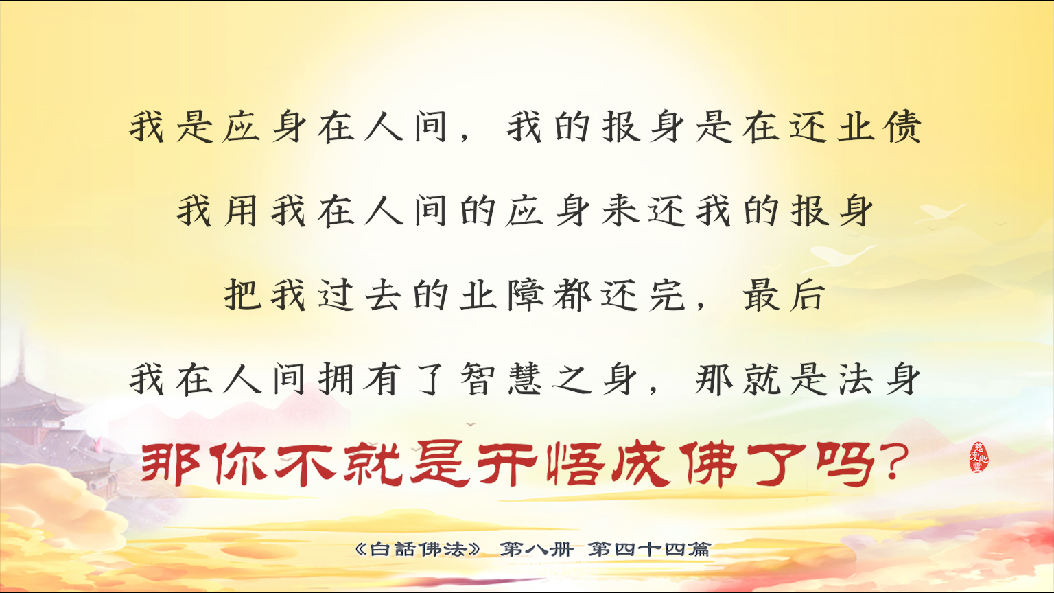 不限会员 8-44-13我是应身在人间,我的报身是在还业债,我用我在人间的应身来还我的报身,把我过去的业障都还完,最后我在人间拥有了智慧之身,那就是法身,那你不就是开悟成佛了吗?【图】