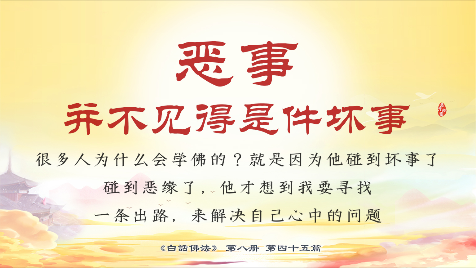 不限会员 8-45-7 恶事并不见得是件坏事。很多人为什么会学佛的?就是因为他碰到坏事了,碰到恶缘了,他才想到我要寻找一条出路,来解决自己心中的问题。【图】