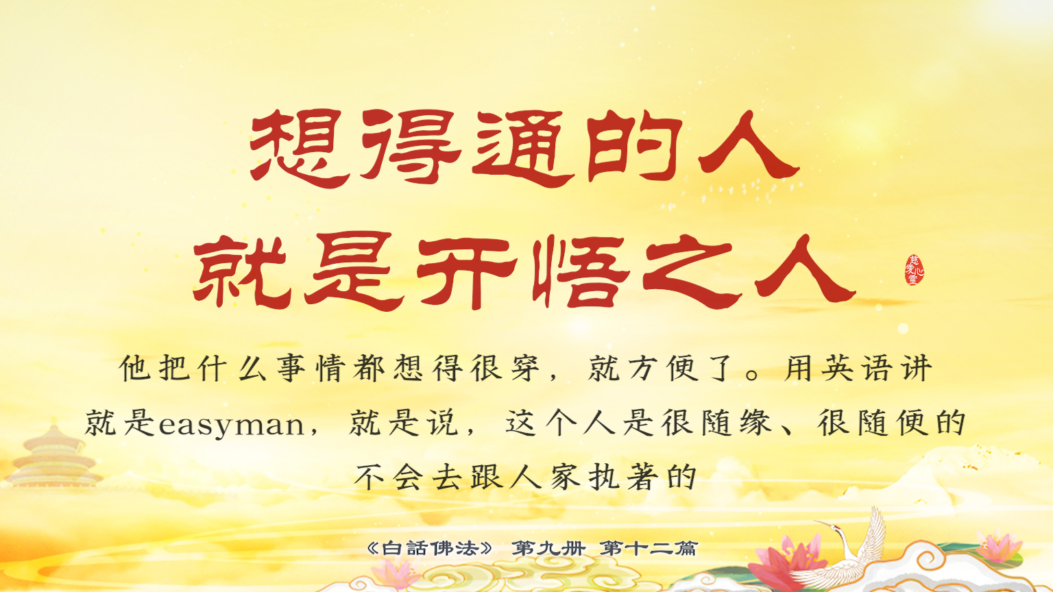 不限会员 9-12-2想得通的人就是开悟之人,他把什么事情都想得很穿,就方便了。用英语讲,就是easyman,就是说,这个人是很随缘、很随便的,不会去跟人家执著的【图】