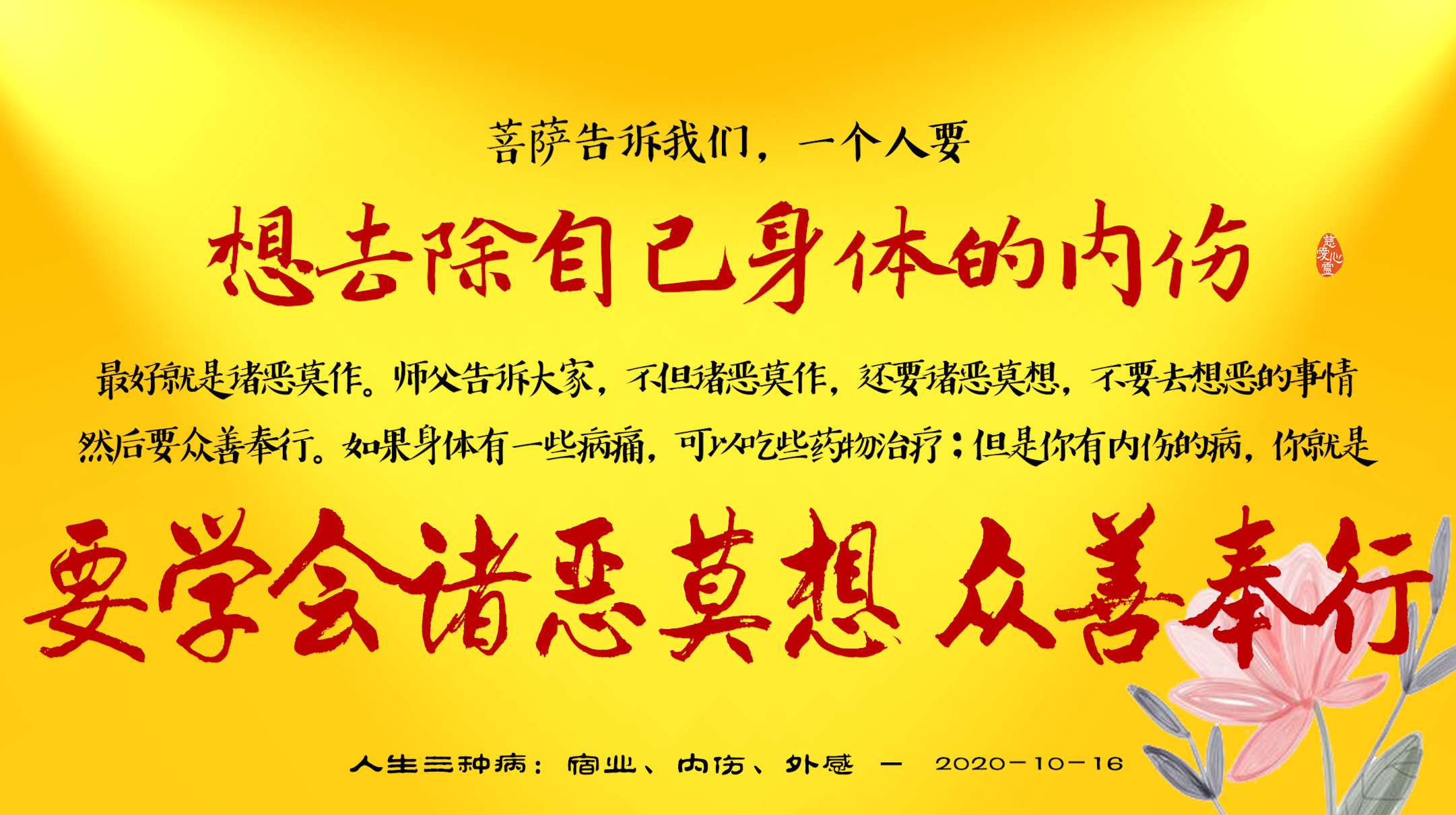 不限会员 2020-10-16-22 一个人要想去除自己身体的内伤,最好就是诸恶莫作...不但诸恶莫作,还要诸恶莫想,不要去想恶的事情,然后要众善奉行...你有内伤的病,你就是要学会诸恶莫想、众善奉行。.jpg