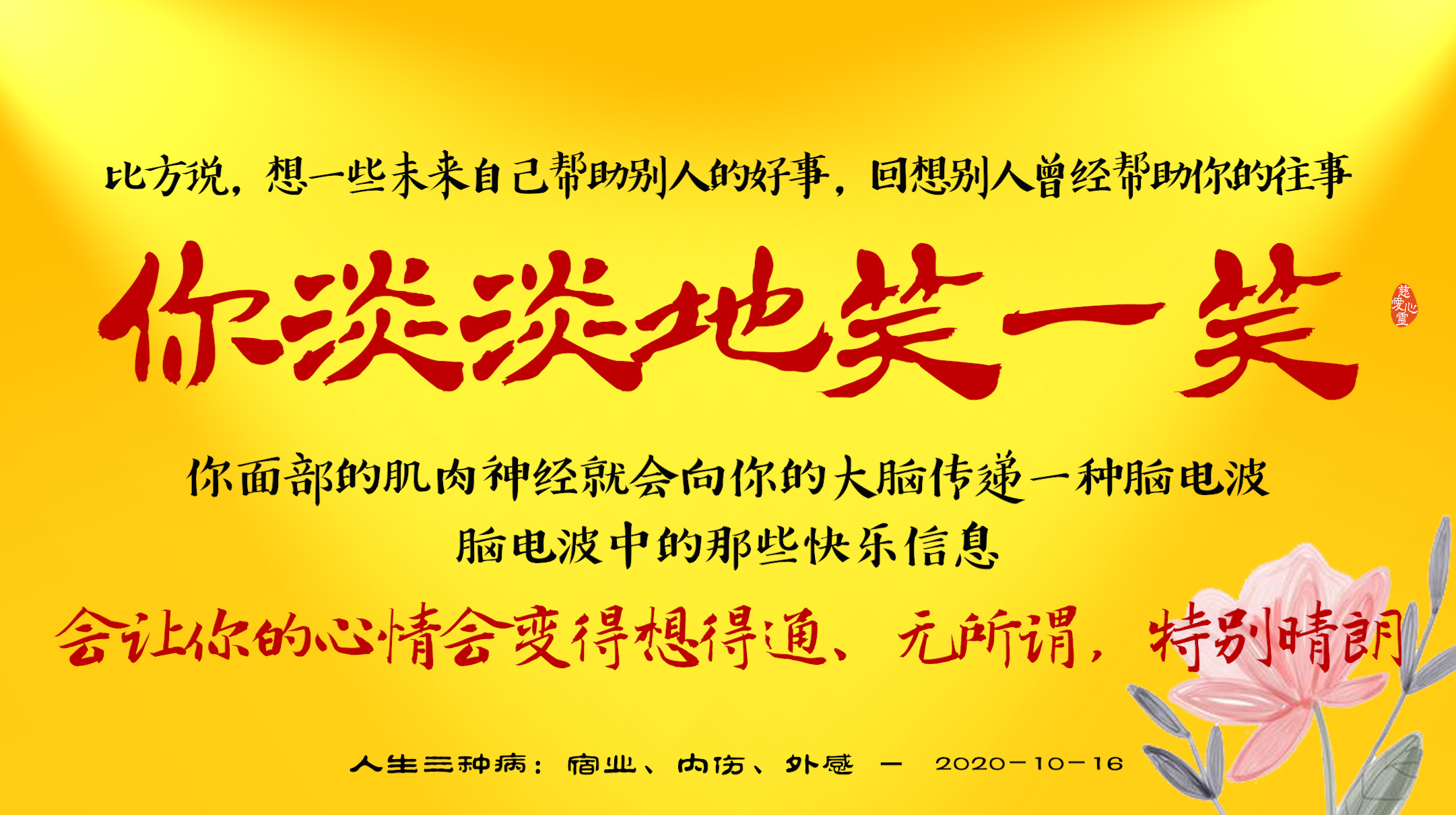 不限会员 2020-10-16-34想一些未来自己帮助别人的好事...你淡淡地笑一笑,你面部的肌肉神经就会向你的大脑传递一种脑电波,脑电波中的那些快乐信息,会让你的心情会变得想得通、无所谓,特别晴朗.jpg
