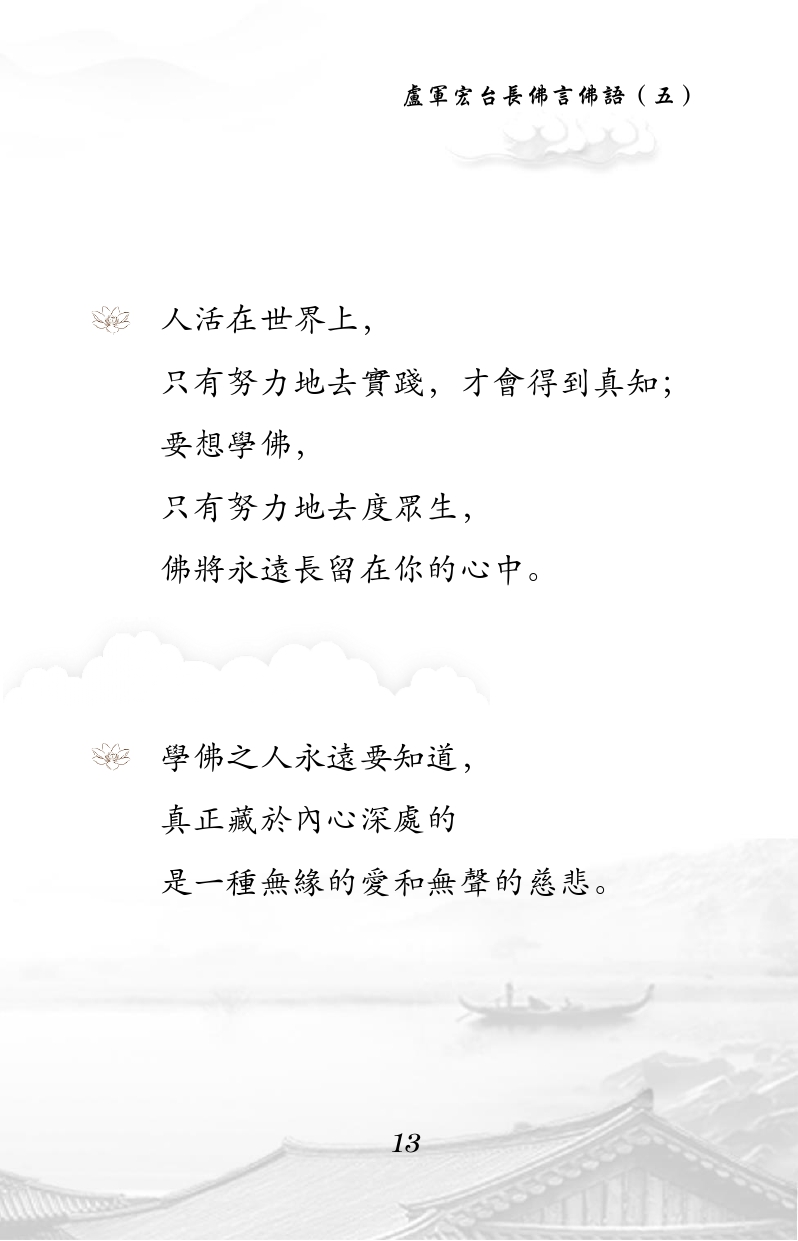不限会员 人活在世界上, 只有努力地去实践,才会得到真知; 要想学佛, 只有努力地去度众生, 佛将永远长留在你的心中。 学佛之人永远要知道, 真正藏于内心深处的 是一种无缘的爱和无声的慈悲。 |佛言佛语 第五册