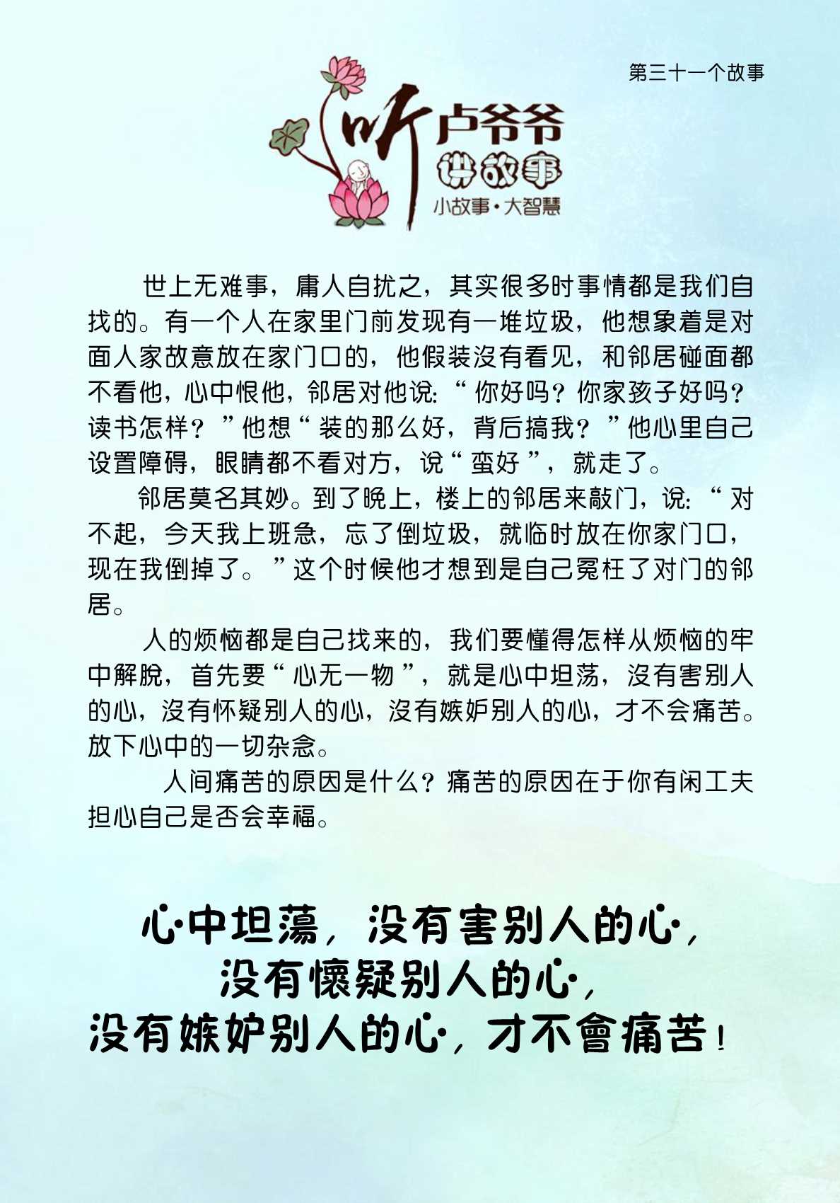 031、心中坦荡,没有害别人的心,没有怀疑别人的心,没有嫉妒别人的心,才不会痛苦!